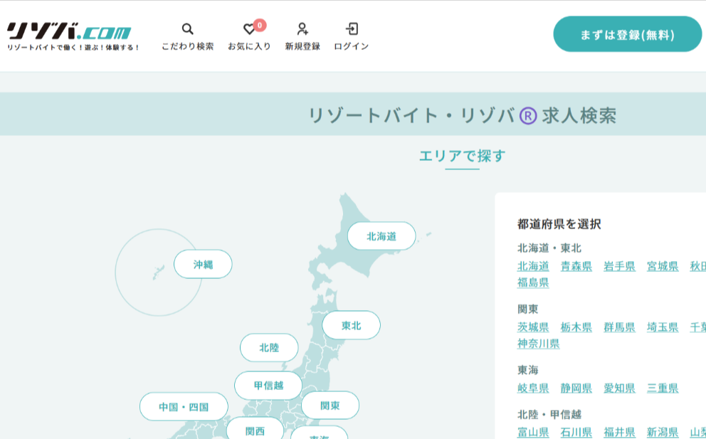 リゾバ.comでは、北海道のスキー場から沖縄のリゾートホテルまで、全国47都道府県を網羅する求人が揃っており、職種もフロントやホール、客室清掃からレアな農業・漁業体験まで幅広いのが特徴です。